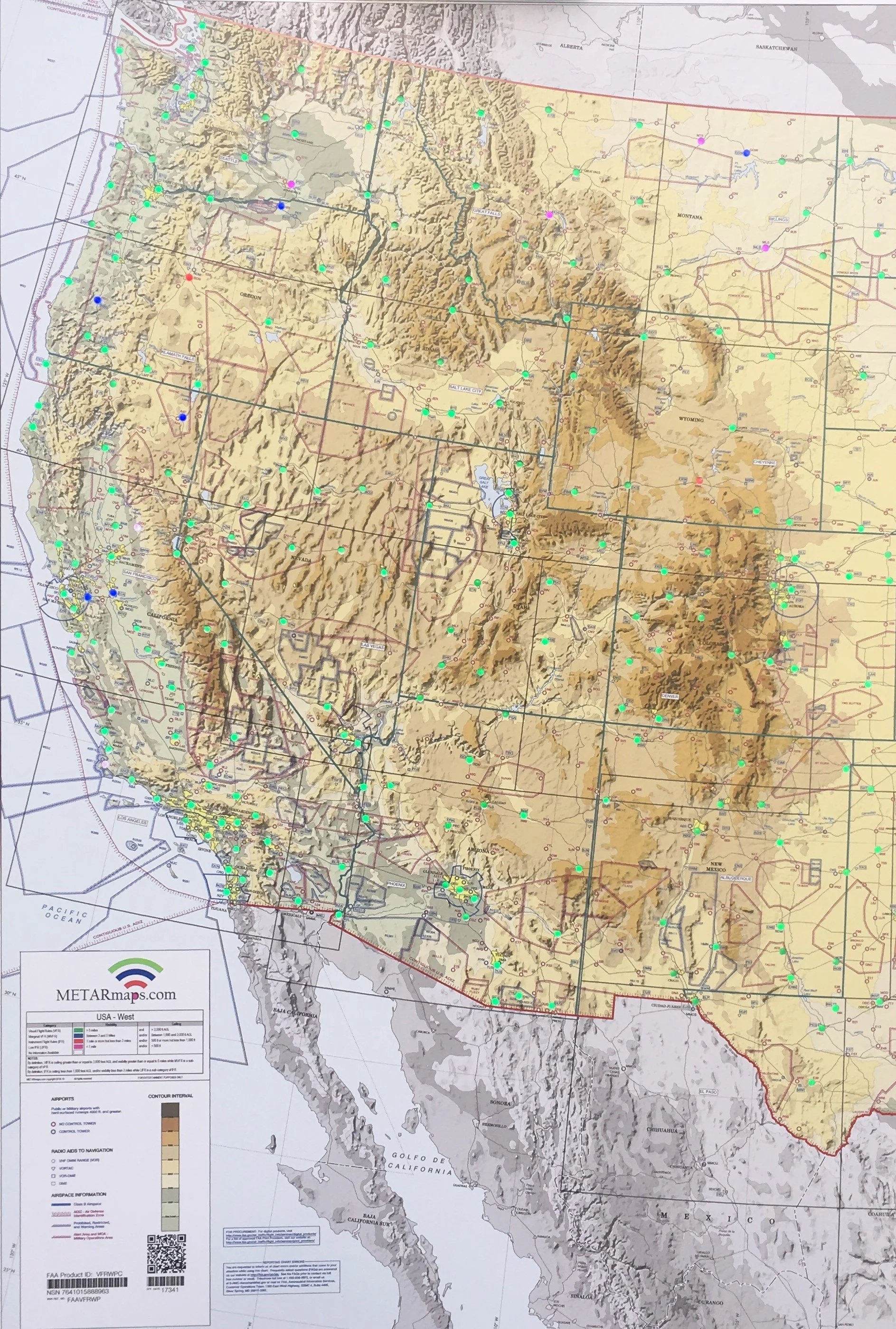 This map covers the entire Western United States. It is 24" W x 36" H x 1" D and has almost 230 lit airport locations. Weather information is presented using the four standard FAA flight category colors: Green/VFR, Blue/MVFR, Red/IFR, Magenta/LIFR as well as all the functionality of Version 4.